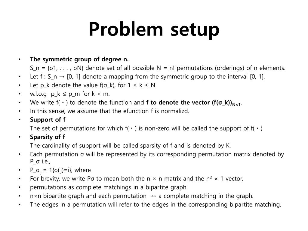 Problem setup • The symmetric group of degree n. S_n= {σ1, . . . , σN} denote set of all possible N = n! permutations (orderings) of n elements. • Let f : S_n→ [0, 1] denote a mapping from the symmetric group to the interval [0, 1]. • Let p_kdenote the value f(σ_k), for 1 ≤ k ≤ N. • w.l.o.gp_k≤ p_m for k < m. • We write f(・) to denote the function and f to denote the vector (f(σ_k))N×1. • In this sense, we assume that the efunction f is normalizd. • Support of f The set of permutations for which f(・) is non-zero will be called the support of f(・) • Sparsity of f The cardinality of support will be called sparsity of f and is denoted by K. • Each permutation σ will be represented by its corresponding permutation matrix denoted by P_σi.e., • P_σij= 1{σ(j)=i}, where • For brevity, we write Pσ to mean both the n × n matrix and the n2 × 1 vector. • permutations as complete matchings in a bipartite graph. • n×n bipartite graph and each permutation ↔ a complete matching in the graph. • The edges in a permutation will refer to the edges in the corresponding bipartite matching.