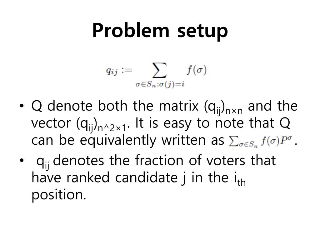 Problem setup • Q denote both the matrix (qij)n×n and the vector (qij)n^2×1. It is easy to note that Q can be equivalently written as . • qijdenotes the fraction of voters that have ranked candidate j in the ithposition.