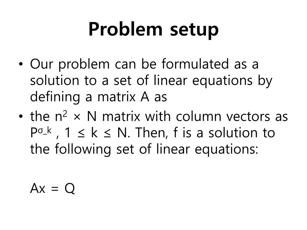 Problem setup • Our problem can be formulated as a solution to a set of linear equations by defining a matrix A as • the n2 × N matrix with column vectors as Pσ_k, 1 ≤ k ≤ N. Then, f is a solution to the following set of linear equations: Ax = Q