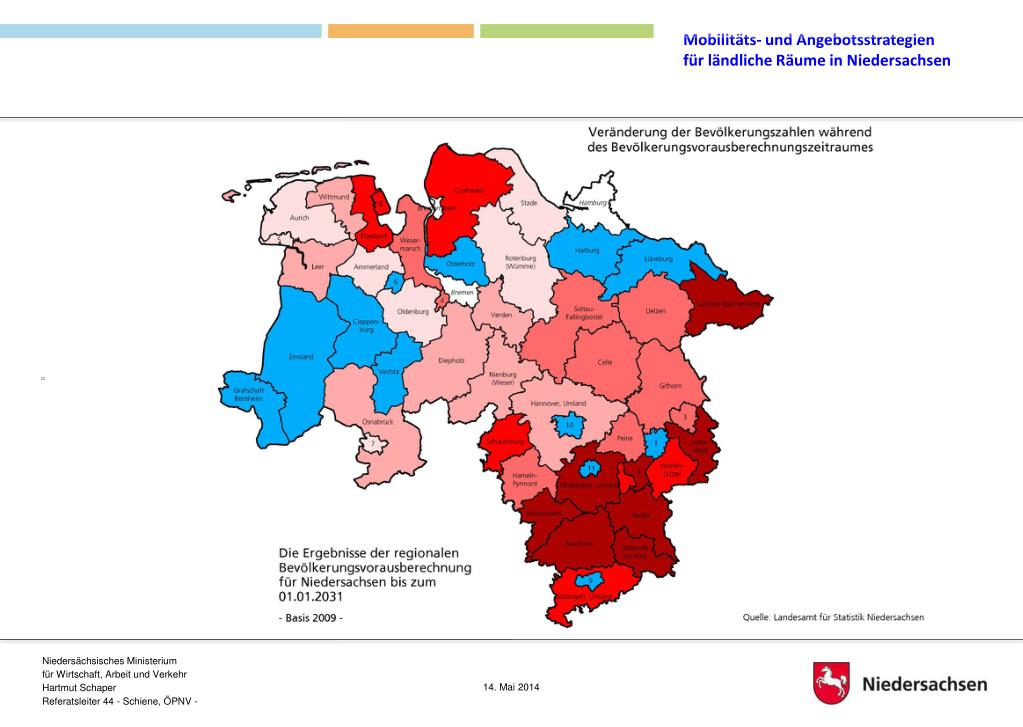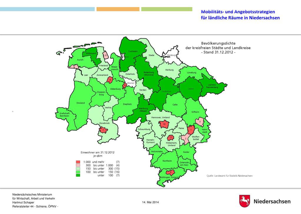 Niedersachsen in Kürze • Fläche: 47.618 km2 • Einwohner: rd. 8 Mio. • Bevölkerungsdichte • (Einwohner/km2): 166 • Landeshauptstadt: Hannover • Erwerbstätige: 3,76 Mio. • Aufgabenträger im ÖPNV: 41 • Haushaltsvolumen 2014 in NI insg.: rd. 27,7 Mrd. € • HH-Volumen MW: rd. 1,5 Mrd. € davon für • Öffentlichen Nahverkehr: 46,6 % • Straßen: 26,6 % • Wirtschaft: 15,7 %