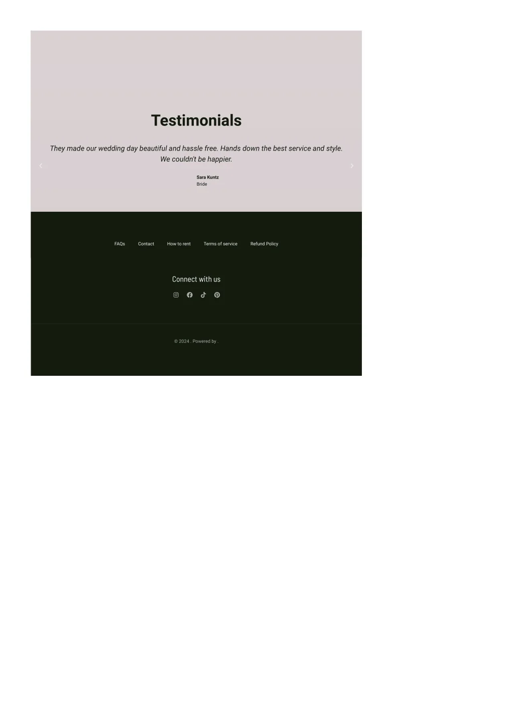 Testimonials They made our wedding day beautiful and hassle free. Hands down the best service and style. We couldn't be happier. Sara Kuntz Bride FAQs Contact How to rent Terms of service Refund Policy Connect with us © 2024 . Powered by .