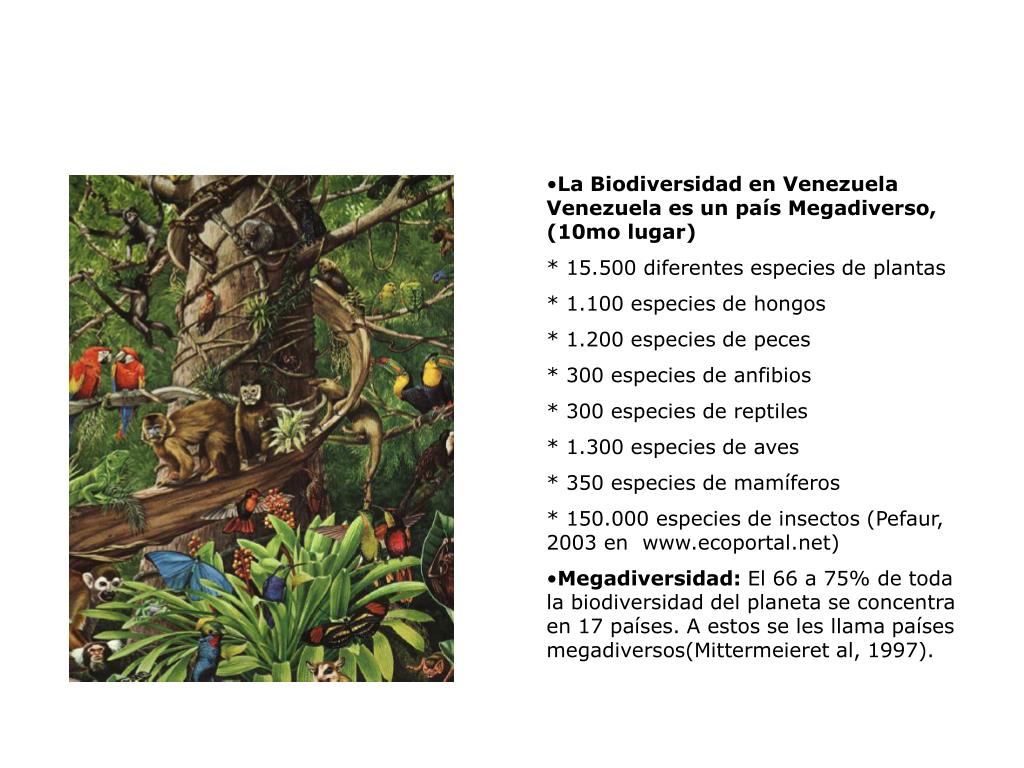 La Biodiversidad en Venezuela Venezuela es un paísMegadiverso, (10mo lugar) • * 15.500 diferentes especies de plantas • * 1.100 especies de hongos • * 1.200 especies de peces • * 300 especies de anfibios • * 300 especies de reptiles • * 1.300 especies de aves • * 350 especies de mamíferos • * 150.000 especies de insectos (Pefaur, 2003 en www.ecoportal.net) • Megadiversidad: El 66 a 75% de toda la biodiversidad del planeta se concentra en 17 países. A estos se les llama países megadiversos(Mittermeieret al, 1997).
