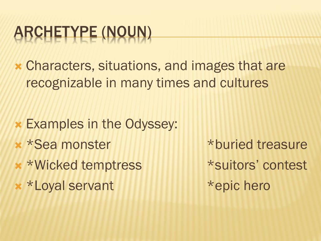 Characters, situations, and images that are recognizable in many times and cultures Examples in the Odyssey: *Sea monster *buried treasure *Wicked temptress *suitors’ contest *Loyal servant *epic hero Archetype (noun)
