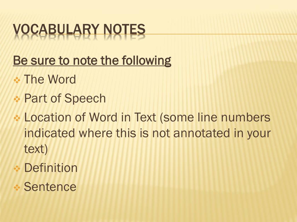 Be sure to note the following • The Word • Part of Speech • Location of Word in Text (some line numbers indicated where this is not annotated in your text) • Definition • Sentence Vocabulary Notes