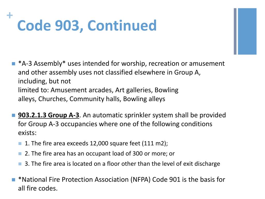 Code 903, Continued • *A-3 Assembly* uses intended for worship, recreation or amusement and other assembly uses not classified elsewhere in Group A, including, but notlimited to: Amusement arcades, Art galleries, Bowlingalleys, Churches, Community halls, Bowling alleys • 903.2.1.3 Group A-3. An automatic sprinkler system shall be provided for Group A-3 occupancies where one of the following conditions exists: • 1. The fire area exceeds 12,000 square feet (111 m2); • 2. The fire area has an occupant load of 300 or more; or • 3. The fire area is located on a floor other than the level of exit discharge • *National Fire Protection Association (NFPA) Code 901 is the basis for all fire codes.