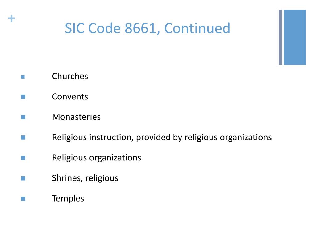 SIC Code 8661, Continued • Churches • Convents • Monasteries • Religious instruction, provided by religious organizations • Religious organizations • Shrines, religious • Temples