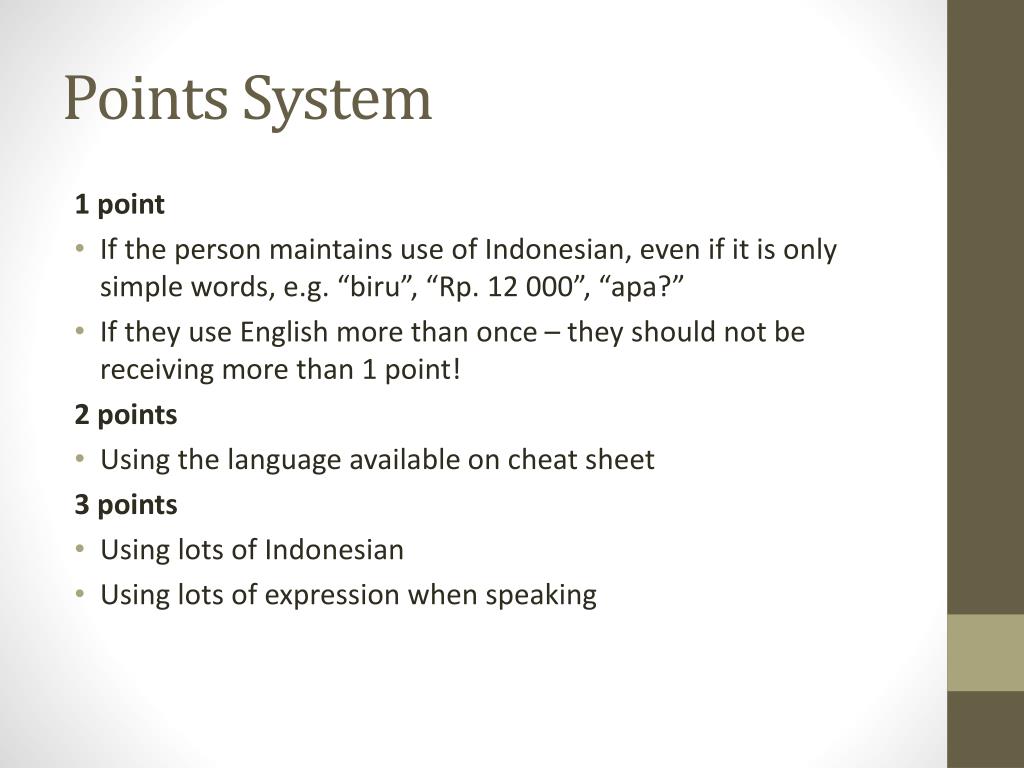 Points System 1 point • If the person maintains use of Indonesian, even if it is only simple words, e.g. “biru”, “Rp. 12 000”, “apa?” • If they use English more than once – they should not be receiving more than 1 point! 2 points • Using the language available on cheat sheet 3 points • Using lots of Indonesian • Using lots of expression when speaking