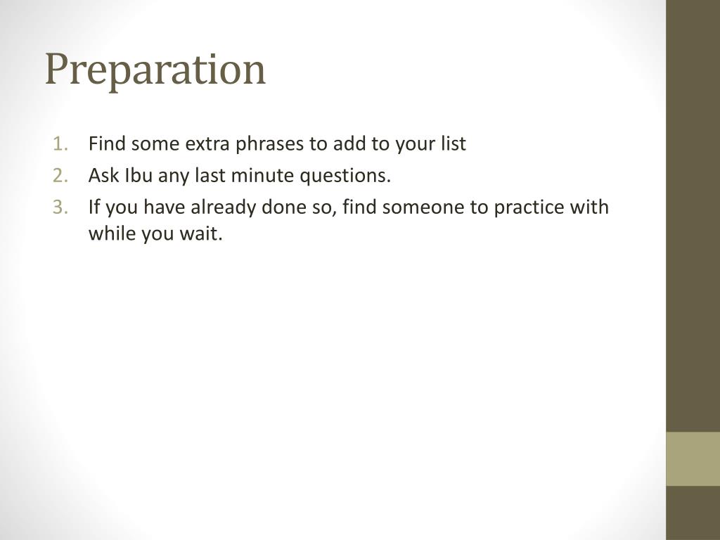 Preparation • Find some extra phrases to add to your list • Ask Ibu any last minute questions. • If you have already done so, find someone to practice with while you wait.