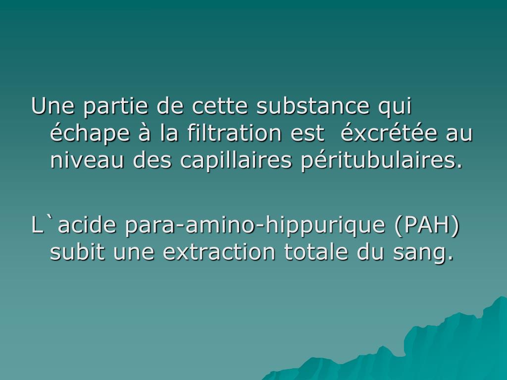 Unepartie de cettesubstancequiéchape à la filtration est éxcrétée au niveau des capillairespéritubulaires. L`acidepara-amino-hippurique (PAH) subituneextraction totale du sang.