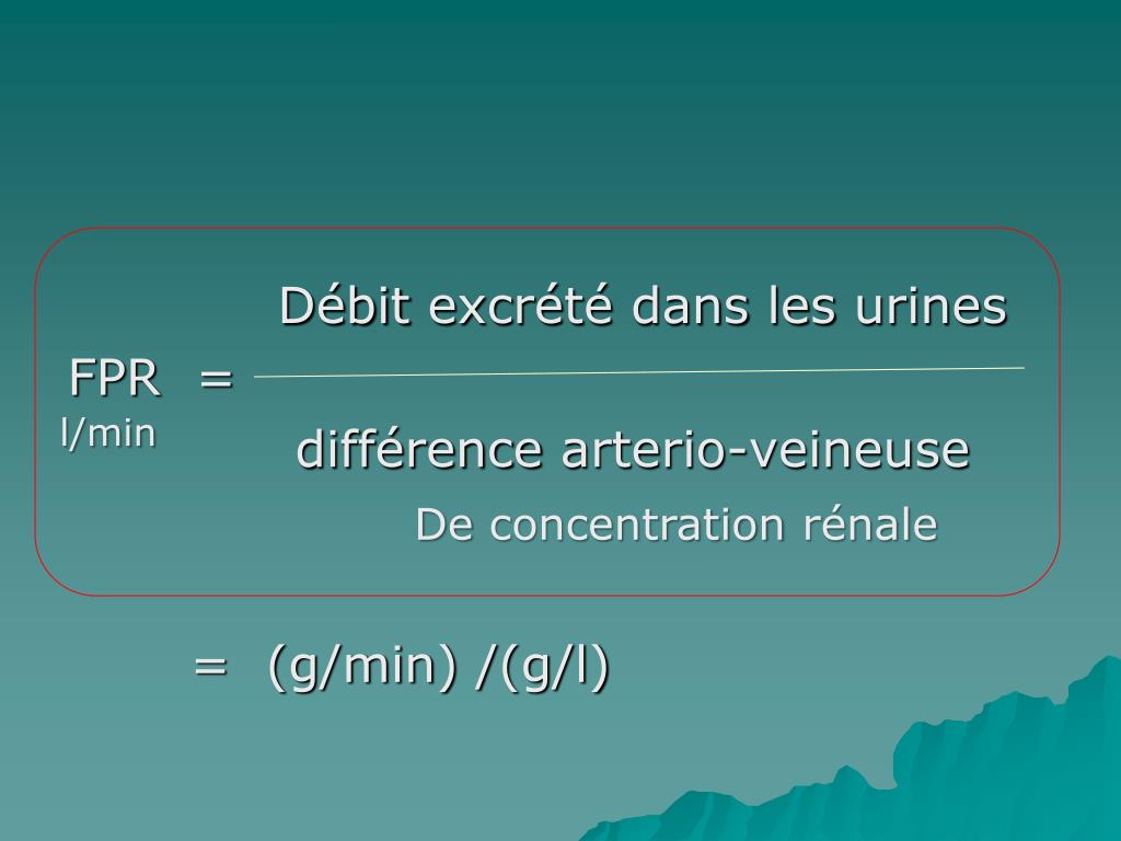 l/min De concentrationrénale Débitexcrétédans les urines FPR = différencearterio-veineuse = (g/min) /(g/l)