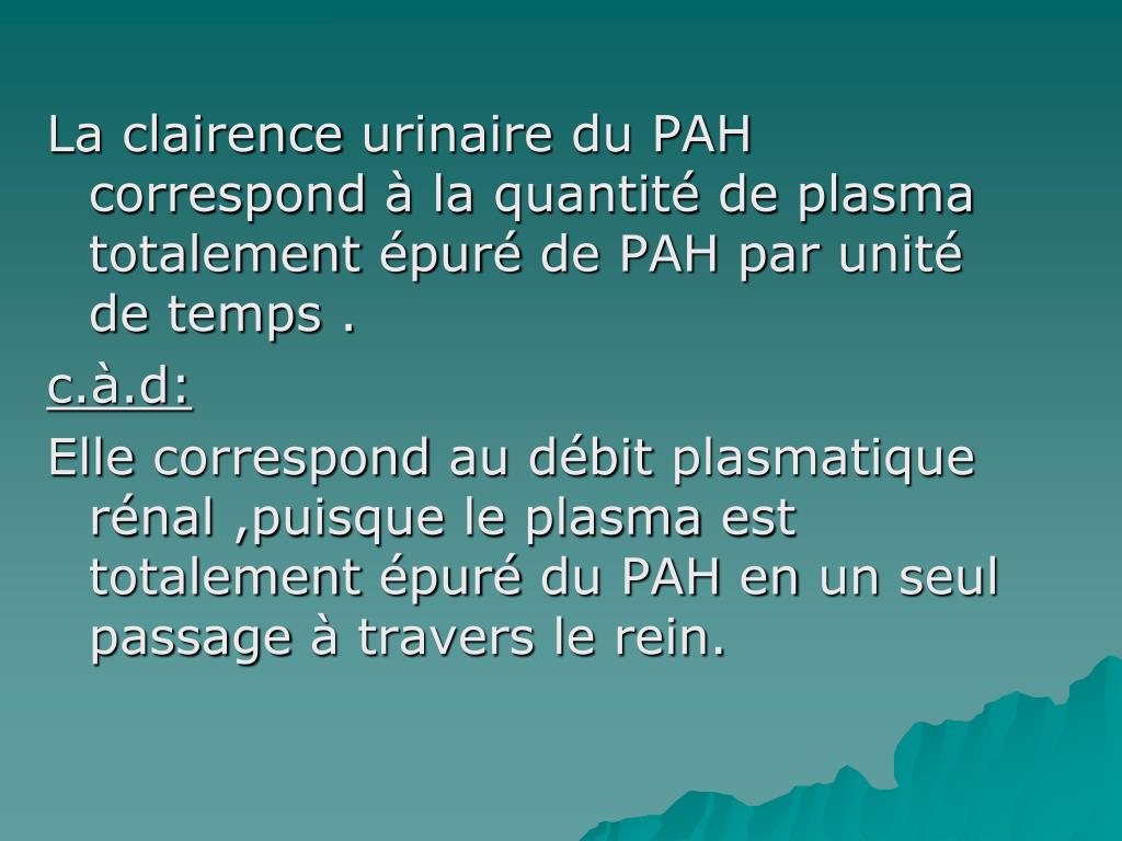 La clairenceurinaire du PAH correspond à la quantité de plasmatotalementépuré de PAH par unité de temps . c.à.d: Elle correspond au débitplasmatiquerénal ,puisque le plasma est totalementépuré du PAH en unseulpassage à travers le rein.