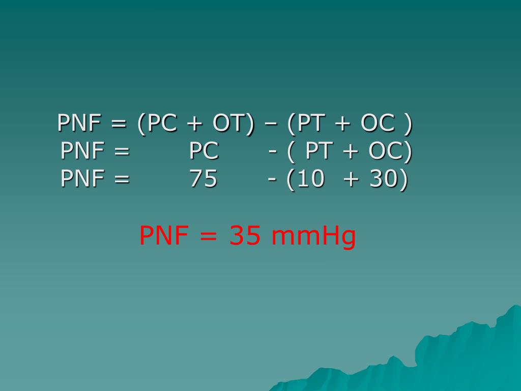 PNF = (PC + OT) – (PT + OC ) PNF = PC - ( PT + OC) PNF = 75 - (10 + 30) PNF = 35 mmHg