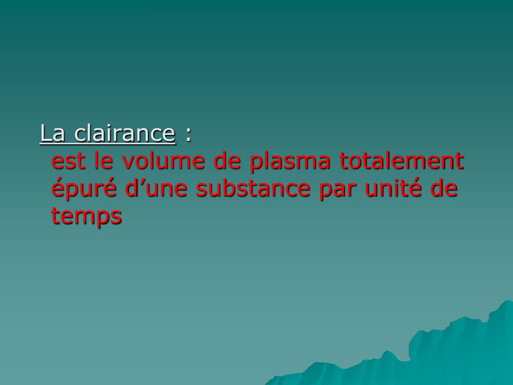 La clairance : est le volume de plasma totalement épuré d’une substance par unité de temps