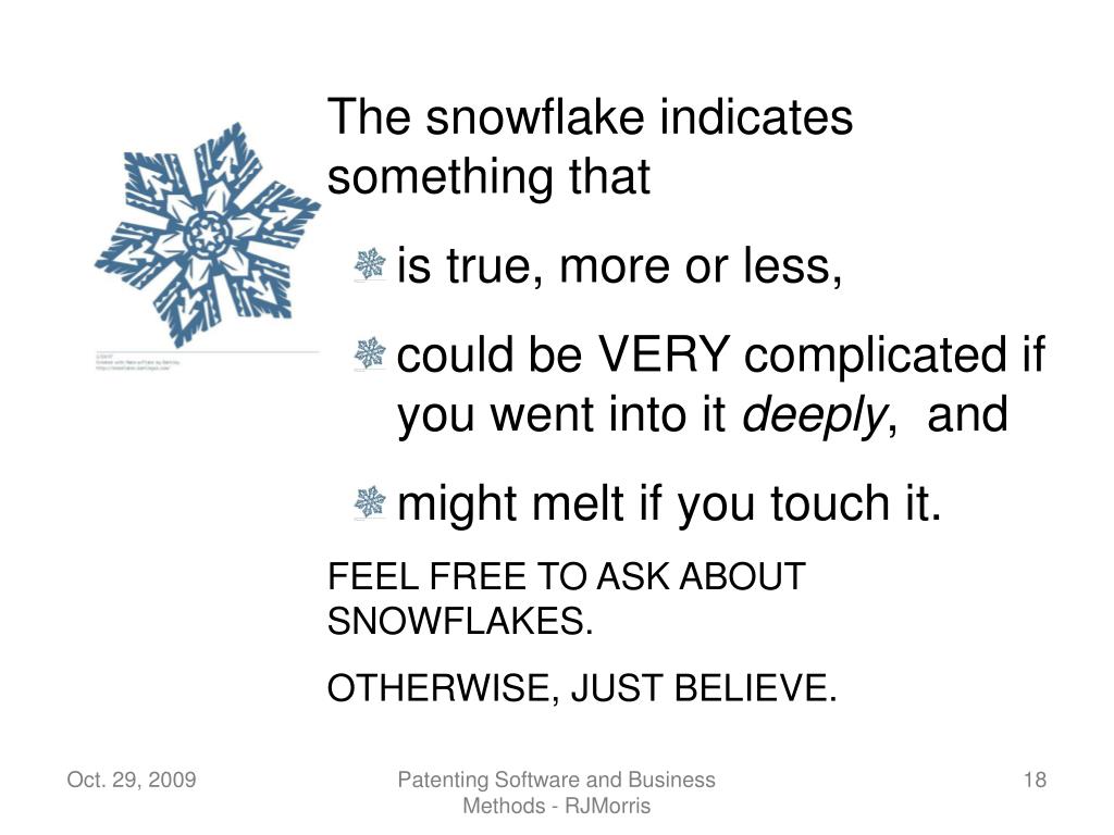 The snowflake indicates something that • is true, more or less, • could be VERY complicated if you went into it deeply, and • might melt if you touch it. • FEEL FREE TO ASK ABOUT SNOWFLAKES. • OTHERWISE, JUST BELIEVE. Patenting Software and Business Methods - RJMorris