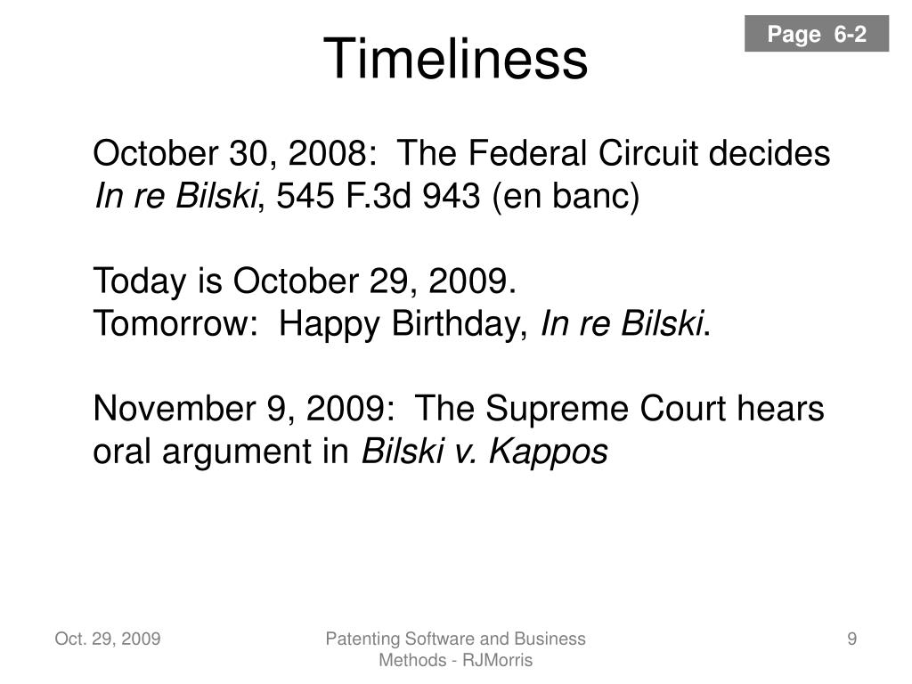 Page 6-2 Timeliness October 30, 2008: The Federal Circuit decides In re Bilski, 545 F.3d 943 (en banc) Today is October 29, 2009. Tomorrow: Happy Birthday, In re Bilski. November 9, 2009: The Supreme Court hears oral argument in Bilski v. Kappos Patenting Software and Business Methods - RJMorris