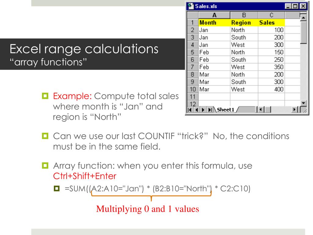 Excel range calculations “array functions” • Example: Compute total sales where month is “Jan” andregion is “North” • Can we use our last COUNTIF “trick?” No, the conditions must be in the same field. • Array function: when you enter this formula, use Ctrl+Shift+Enter • =SUM((A2:A10="Jan") * (B2:B10="North") * C2:C10) Multiplying 0 and 1 values