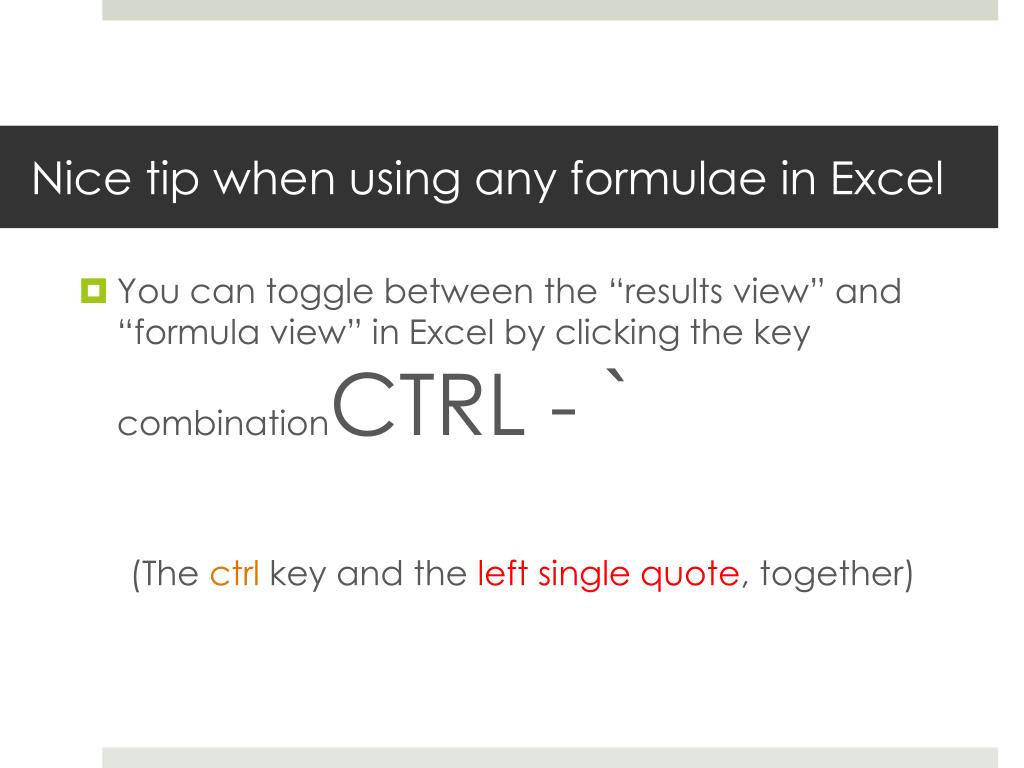Nice tip when using any formulae in Excel • You can toggle between the “results view” and “formula view” in Excel by clicking the key combinationCTRL- ` (The ctrl key and the left single quote, together)
