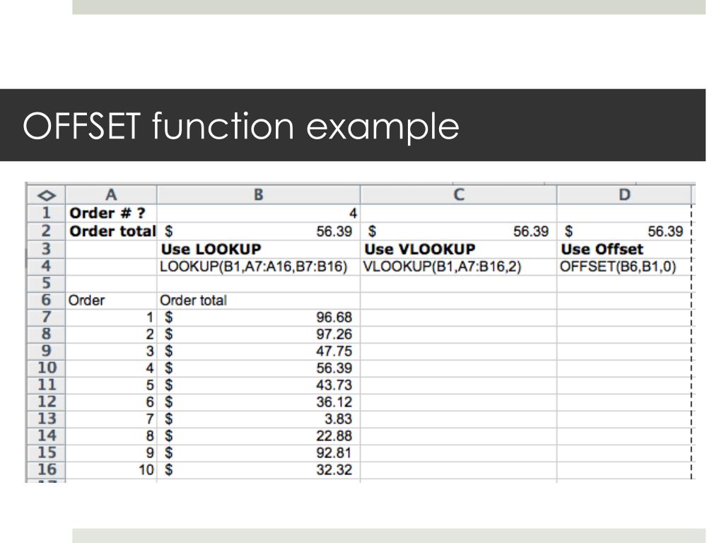 A different approach for finding a particular cell: the OFFSET function • OFFSET • Allows you to return the value of any cell by specifying its location in your spreadsheet relative to another cell. • Syntax: • =offset(reference_cell, rows_down, cols_right)