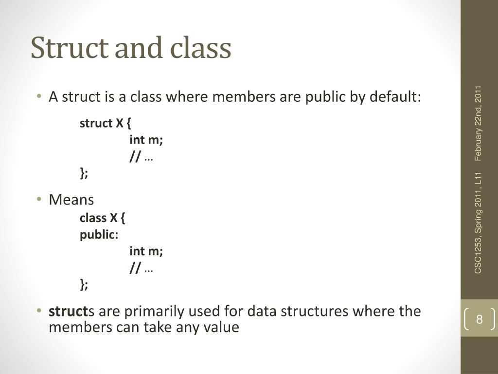 Struct and class A struct is a class where members are public by default: struct X { int m; // … }; Means class X { public: int m; // … }; structs are primarily used for data structures where the members can take any value CSC1253, Spring 2011, L11