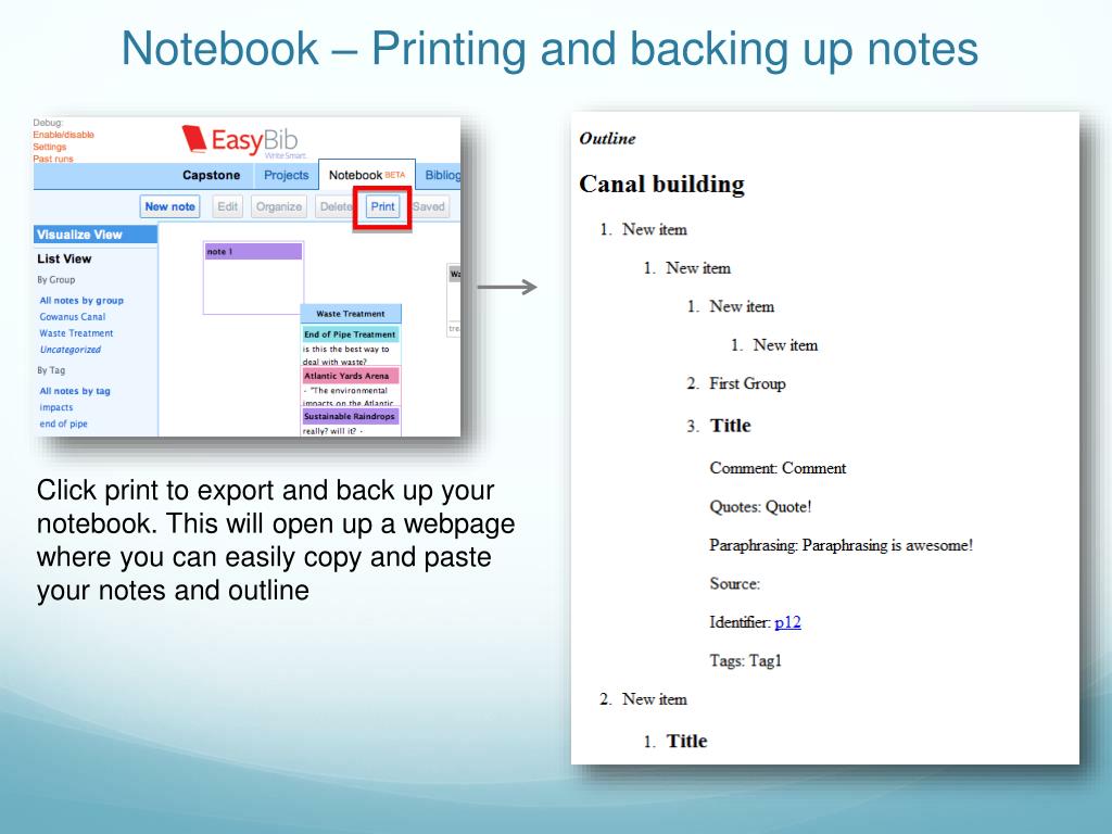 Notebook – Printing and backing up notes Click print to export and back up your notebook. This will open up a webpage where you can easily copy and paste your notes and outline
