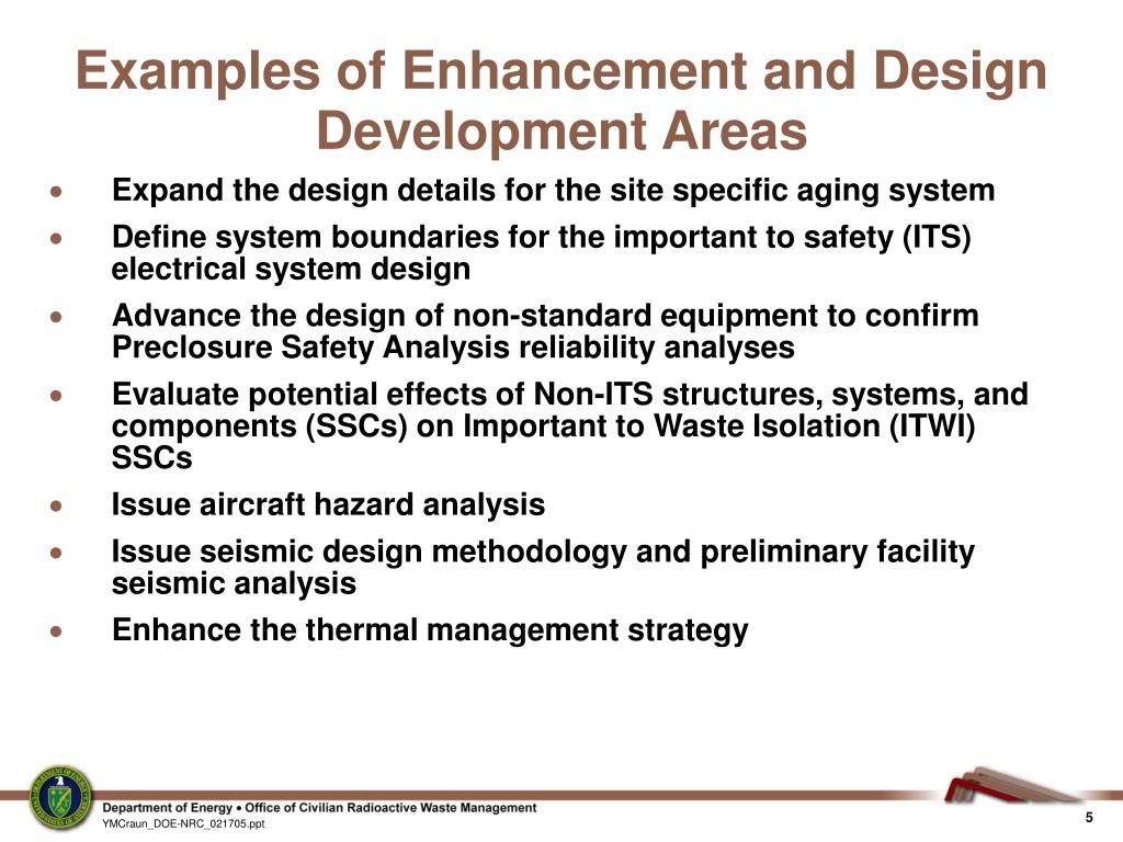 Examples of Enhancement and Design Development Areas • Expand the design details for the site specific aging system • Define system boundaries for the important to safety (ITS) electrical system design • Advance the design of non-standard equipment to confirm Preclosure Safety Analysis reliability analyses • Evaluate potential effects of Non-ITS structures, systems, and components (SSCs) on Important to Waste Isolation (ITWI) SSCs • Issue aircraft hazard analysis • Issue seismic design methodology and preliminary facility seismic analysis • Enhance the thermal management strategy