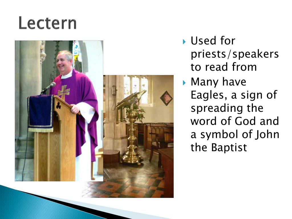 Lectern • Used for priests/speakers to read from • Many have Eagles, a sign of spreading the word of God and a symbol of John the Baptist