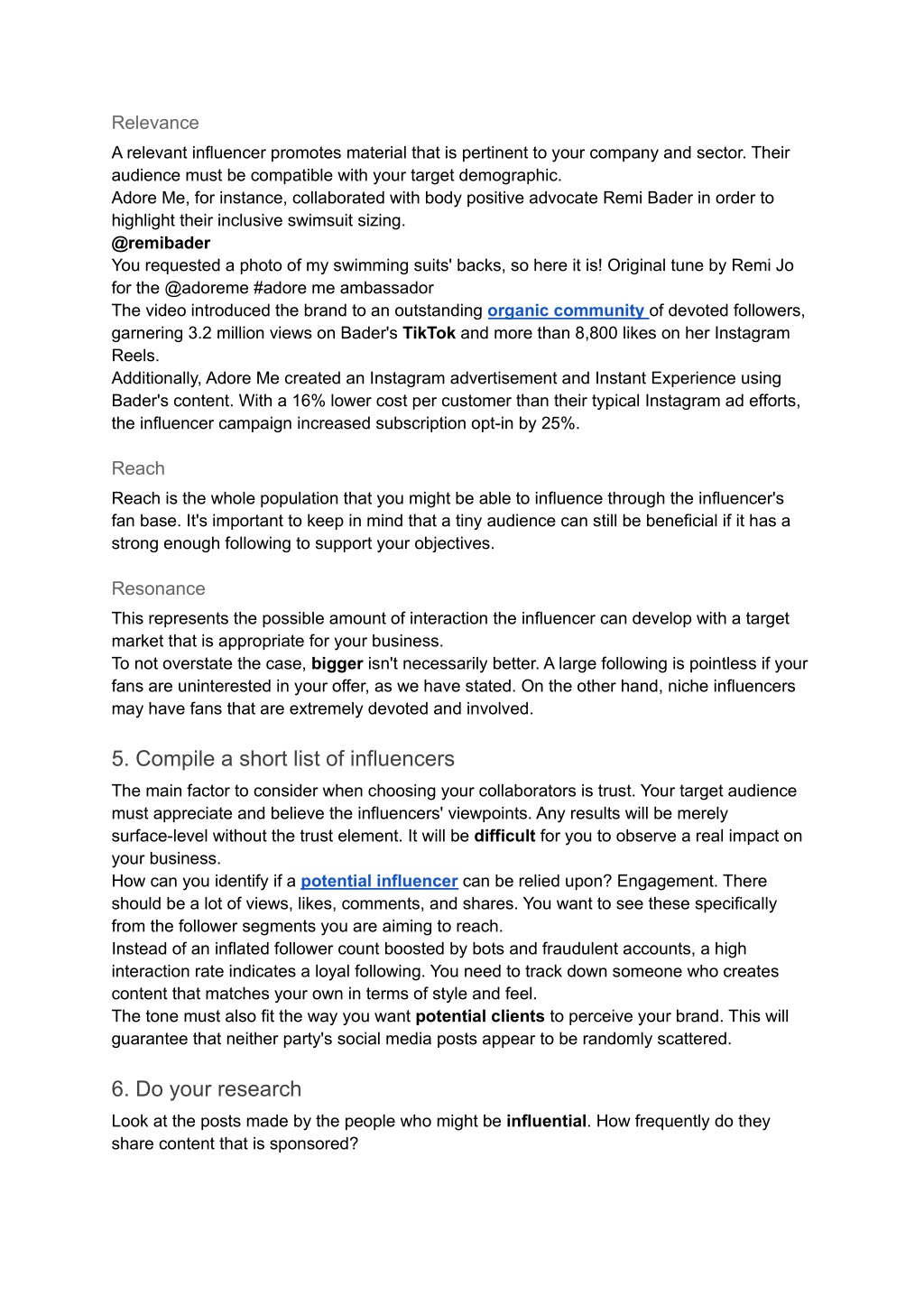 Relevance A relevant influencer promotes material that is pertinent to your company and sector. Their audience must be compatible with your target demographic. Adore Me, for instance, collaborated with body positive advocate Remi Bader in order to highlight their inclusive swimsuit sizing. @remibader You requested a photo of my swimming suits' backs, so here it is! Original tune by Remi Jo for the @adoreme #adore me ambassador The video introduced the brand to an outstanding organic community of devoted followers, garnering 3.2 million views on Bader's TikTok and more than 8,800 likes on her Instagram Reels. Additionally, Adore Me created an Instagram advertisement and Instant Experience using Bader's content. With a 16% lower cost per customer than their typical Instagram ad efforts, the influencer campaign increased subscription opt-in by 25%. Reach Reach is the whole population that you might be able to influence through the influencer's fan base. It's important to keep in mind that a tiny audience can still be beneficial if it has a strong enough following to support your objectives. Resonance This represents the possible amount of interaction the influencer can develop with a target market that is appropriate for your business. To not overstate the case, bigger isn't necessarily better. A large following is pointless if your fans are uninterested in your offer, as we have stated. On the other hand, niche influencers may have fans that are extremely devoted and involved. 5. Compile a short list of influencers The main factor to consider when choosing your collaborators is trust. Your target audience must appreciate and believe the influencers' viewpoints. Any results will be merely surface-level without the trust element. It will be difficult for you to observe a real impact on your business. How can you identify if a potential influencer can be relied upon? Engagement. There should be a lot of views, likes, comments, and shares. You want to see these specifically from the follower segments you are aiming to reach. Instead of an inflated follower count boosted by bots and fraudulent accounts, a high interaction rate indicates a loyal following. You need to track down someone who creates content that matches your own in terms of style and feel. The tone must also fit the way you want potential clients to perceive your brand. This will guarantee that neither party's social media posts appear to be randomly scattered. 6. Do your research Look at the posts made by the people who might be influential. How frequently do they share content that is sponsored?