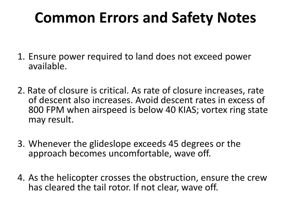Common Errors and Safety Notes 1. Ensure power required to land does not exceed power available. 2. Rate of closure is critical. As rate of closure increases, rate of descent also increases. Avoid descent rates in excess of 800 FPM when airspeed is below 40 KIAS; vortex ring state may result. • Whenever the glideslope exceeds 45 degrees or the approach becomes uncomfortable, wave off. 4. As the helicopter crosses the obstruction, ensure the crew has cleared the tail rotor. If not clear, wave off.