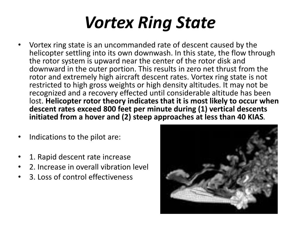 Vortex Ring State • Vortex ring state is an uncommanded rate of descent caused by the helicopter settling into its own downwash. In this state, the flow through the rotor system is upward near the center of the rotor disk and downward in the outer portion. This results in zero net thrust from the rotor and extremely high aircraft descent rates. Vortex ring state is not restricted to high gross weights or high density altitudes. It may not be recognized and a recovery effected until considerable altitude has been lost. Helicopter rotor theory indicates that it is most likely to occur when descent rates exceed 800 feet per minute during (1) vertical descents initiated from a hover and (2) steep approaches at less than 40 KIAS. • Indications to the pilot are: • 1. Rapid descent rate increase • 2. Increase in overall vibration level • 3. Loss of control effectiveness
