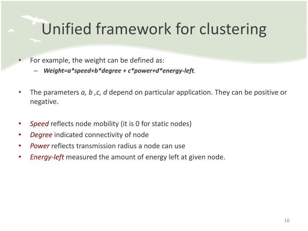 Unified framework for clustering • For example, the weight can be defined as: • Weight=a*speed+b*degree + c*power+d*energy-left. • The parameters a, b ,c, d depend on particular application. They can be positive or negative. • Speedreflects node mobility (it is 0 for static nodes) • Degreeindicated connectivity of node • Powerreflects transmission radius a node can use • Energy-leftmeasured the amount of energy left at given node.