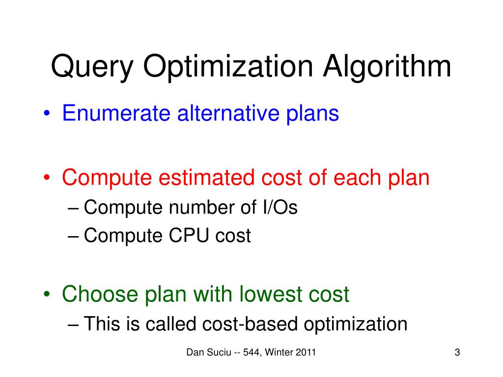 CSE544 Query Optimization. Tuesday-Thursday , February 8 th -10 th , 2011. Outline. Chapter 15 in the textbook. Query Optimization Algorithm. Enumerate alternative plans Compute estimated cost of each plan Compute number of I/Os Compute CPU cost Choose plan with lowest cost
