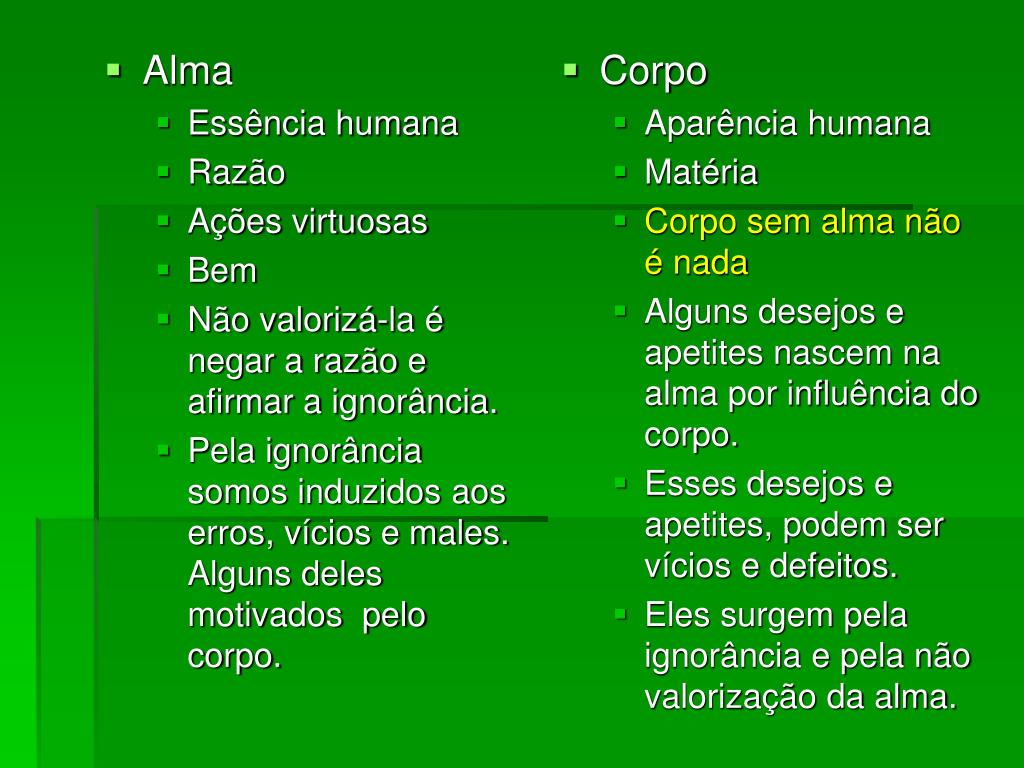 Alma • Essência humana • Razão • Ações virtuosas • Bem • Não valorizá-la é negar a razão e afirmar a ignorância. • Pela ignorância somos induzidos aos erros, vícios e males. Alguns deles motivados pelo corpo. • Corpo • Aparência humana • Matéria • Corpo sem alma não é nada • Alguns desejos e apetites nascem na alma por influência do corpo. • Esses desejos e apetites, podem ser vícios e defeitos. • Eles surgem pela ignorância e pela não valorização da alma.