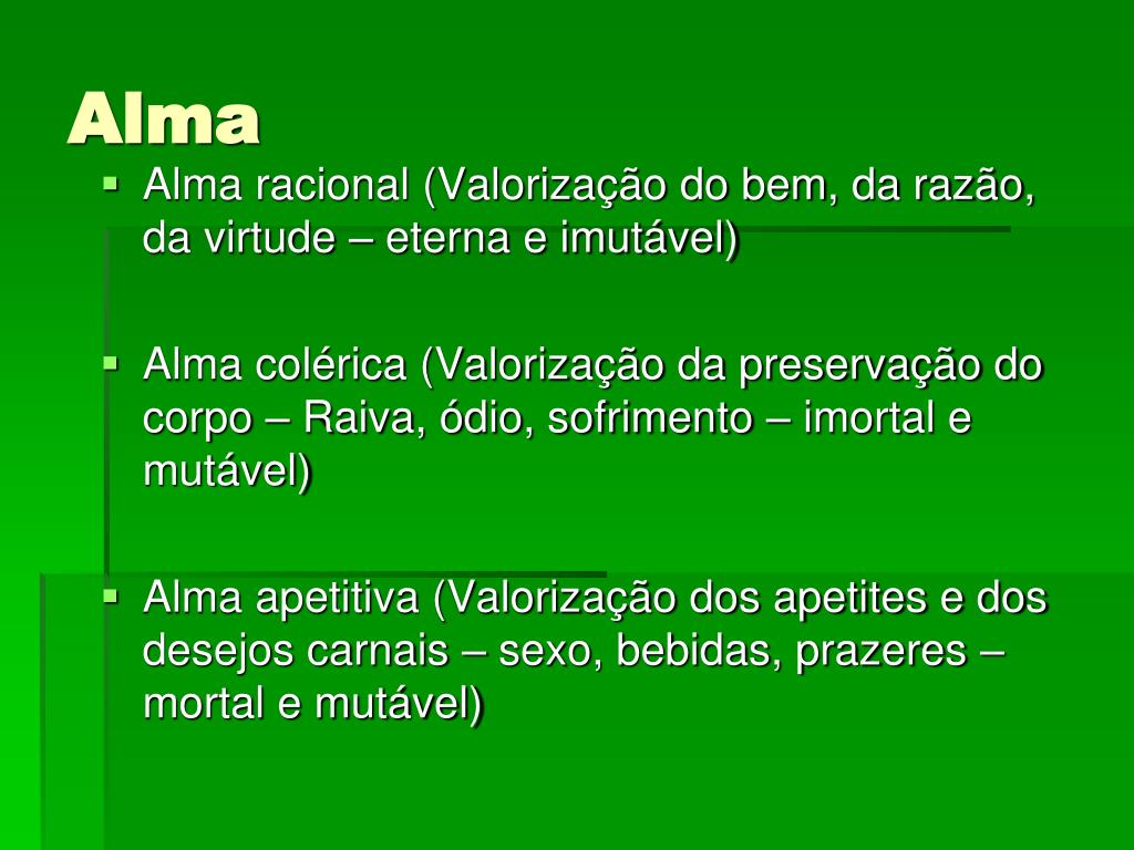 Alma Alma racional (Valorização do bem, da razão, da virtude – eterna e imutável) Alma colérica (Valorização da preservação do corpo – Raiva, ódio, sofrimento – imortal e mutável) Alma apetitiva (Valorização dos apetites e dos desejos carnais – sexo, bebidas, prazeres – mortal e mutável)