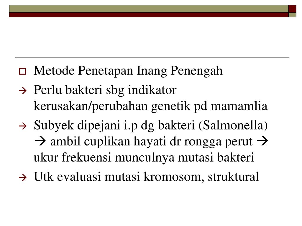 Metode Penetapan Inang Penengah • Perlu bakteri sbg indikator kerusakan/perubahan genetik pd mamamlia • Subyek dipejani i.p dg bakteri (Salmonella) ambil cuplikan hayati dr rongga perut ukur frekuensi munculnya mutasi bakteri • Utk evaluasi mutasi kromosom, struktural