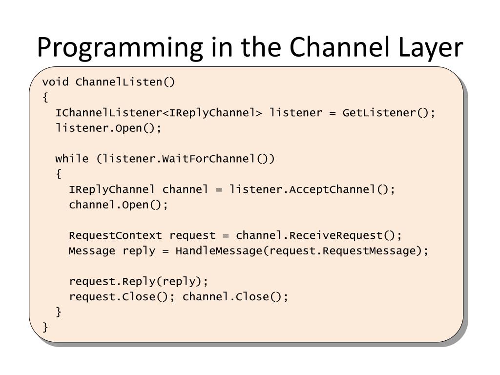 Programming in the Channel Layer void ChannelListen() { IChannelListener<IReplyChannel> listener = GetListener(); listener.Open(); while (listener.WaitForChannel()) { IReplyChannel channel = listener.AcceptChannel(); channel.Open(); RequestContext request = channel.ReceiveRequest(); Message reply = HandleMessage(request.RequestMessage); request.Reply(reply); request.Close(); channel.Close(); } } • Explicit message passing like in sockets or MSMQ • What happened to easy?