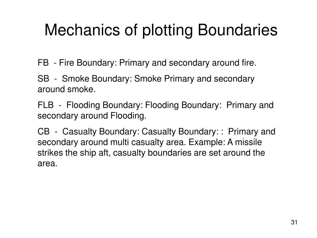 Mechanics of plotting Boundaries FB - Fire Boundary: Primary and secondary around fire. SB - Smoke Boundary: Smoke Primary and secondary around smoke. FLB - Flooding Boundary: Flooding Boundary: Primary and secondary around Flooding. CB - Casualty Boundary: Casualty Boundary: : Primary and secondary around multi casualty area. Example: A missile strikes the ship aft, casualty boundaries are set around the area.