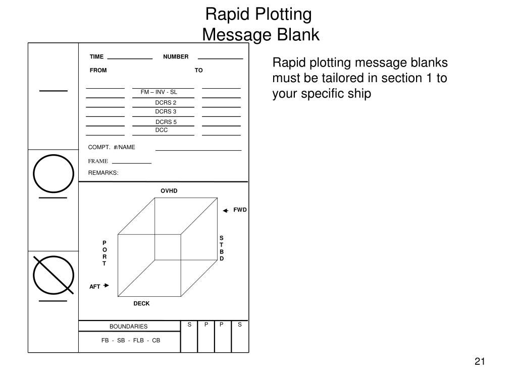 Rapid Plotting Message Blank TIME NUMBER FROM TO • Rapid plotting message blanks • must be tailored in section 1 to • your specific ship FM – INV - SL DCRS 2 DCRS 3 DCRS 5 DCC COMPT. #/NAME FRAME REMARKS: OVHD FWD STBD PORT AFT S P P S DECK BOUNDARIES FB - SB - FLB - CB