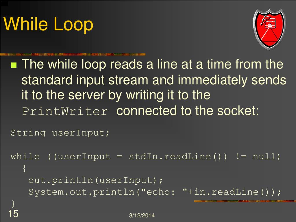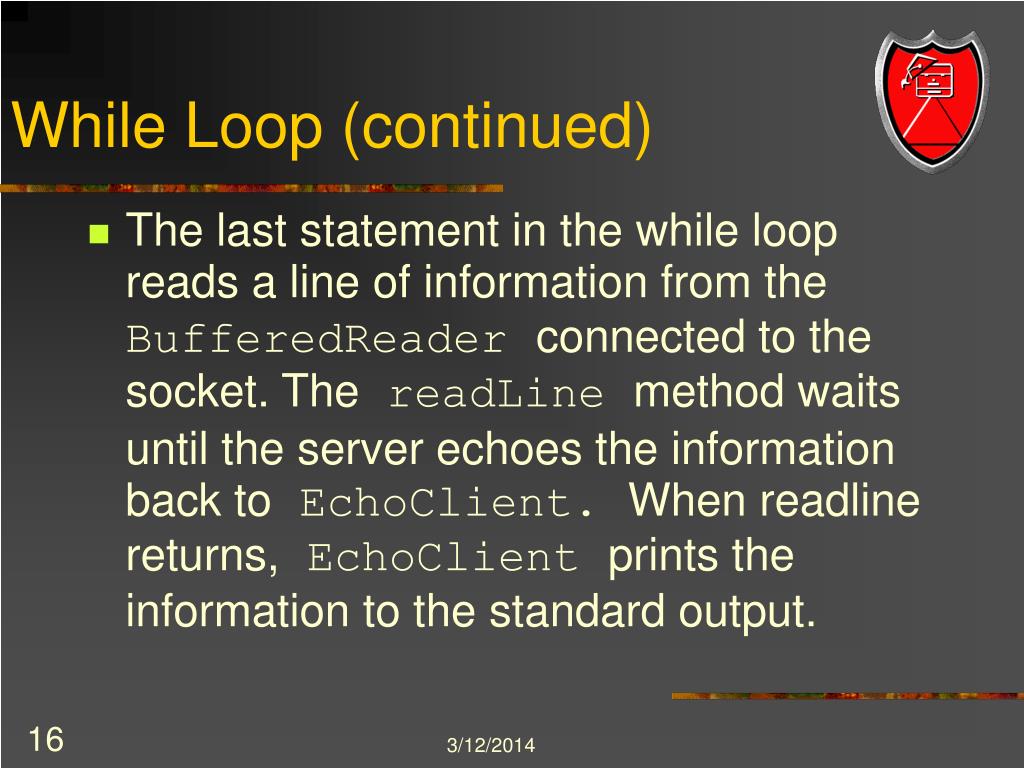 While Loop (continued) • The last statement in the while loop reads a line of information from the BufferedReader connected to the socket. The readLine method waits until the server echoes the information back to EchoClient. When readline returns, EchoClient prints the information to the standard output.