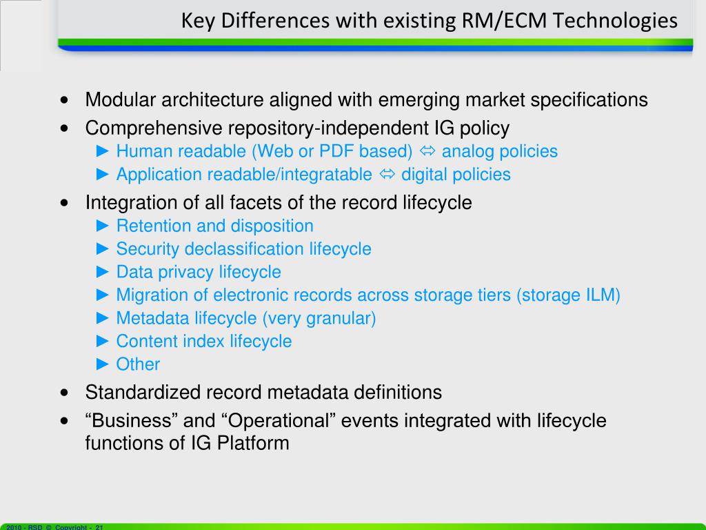 Key Differences with existing RM/ECM Technologies • Modular architecture aligned with emerging market specifications • Comprehensive repository-independent IG policy • Human readable (Web or PDF based) analog policies • Application readable/integratable digital policies • Integration of all facets of the record lifecycle • Retention and disposition • Security declassification lifecycle • Data privacy lifecycle • Migration of electronic records across storage tiers (storage ILM) • Metadata lifecycle (very granular) • Content index lifecycle • Other • Standardized record metadata definitions • “Business” and “Operational” events integrated with lifecycle functions of IG Platform