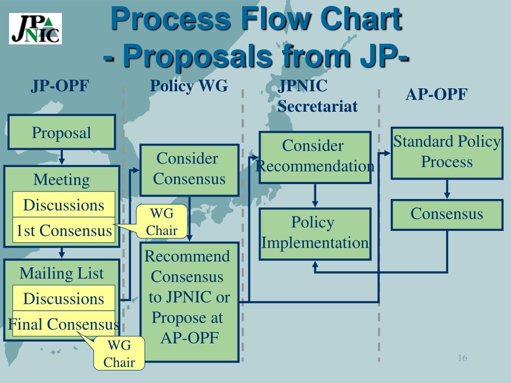 Process Flow Chart- Proposals from JP- JP-OPF Policy WG JPNIC Secretariat AP-OPF Proposal Standard Policy Process Consider Recommendation Consider Consensus Meeting Discussions Consensus WG Chair Policy Implementation 1st Consensus Recommend Consensus to JPNIC or Propose at AP-OPF Mailing List Discussions Final Consensus WG Chair