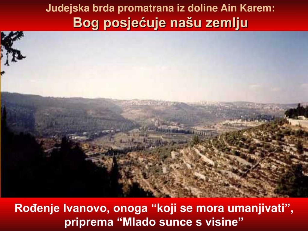 Judejska brda promatrana iz doline Ain Karem: Bog posjećuje našu zemlju Rođenje Ivanovo, onoga “koji se mora umanjivati”, priprema “Mlado sunce s visine”