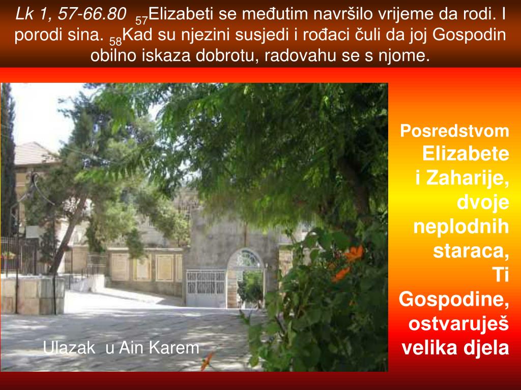 Lk 1, 57-66.80 57Elizabeti se međutim navršilo vrijeme da rodi. I porodi sina. 58Kad su njezini susjedi i rođaci čuli da joj Gospodin obilno iskaza dobrotu, radovahu se s njome. Posredstvom Elizabete i Zaharije, dvoje neplodnih staraca,TiGospodine, ostvaruješ velika djela Ulazak u Ain Karem