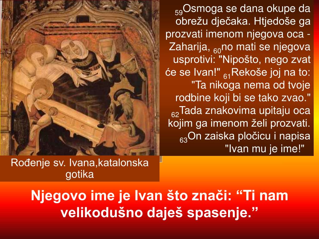 59Osmoga se dana okupe da obrežu dječaka. Htjedoše ga prozvati imenom njegova oca - Zaharija, 60no mati se njegova usprotivi: "Nipošto, nego zvat će se Ivan!" 61Rekoše joj na to: "Ta nikoga nema od tvoje rodbine koji bi se tako zvao." 62Tada znakovima upitaju oca kojim ga imenom želi prozvati. 63On zaiska pločicu i napisa "Ivan mu je ime!" Rođenje sv. Ivana,katalonska gotika Njegovo ime je Ivan što znači: “Ti nam velikodušno daješ spasenje.”