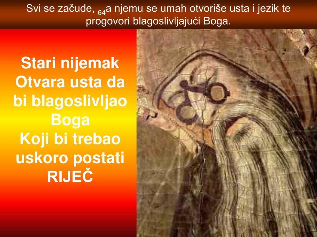 Svi se začude, 64a njemu se umah otvoriše usta i jezik te progovori blagoslivljajući Boga. Stari nijemak Otvara usta da bi blagoslivljao Boga Koji bi trebao uskoro postatiRIJEČ