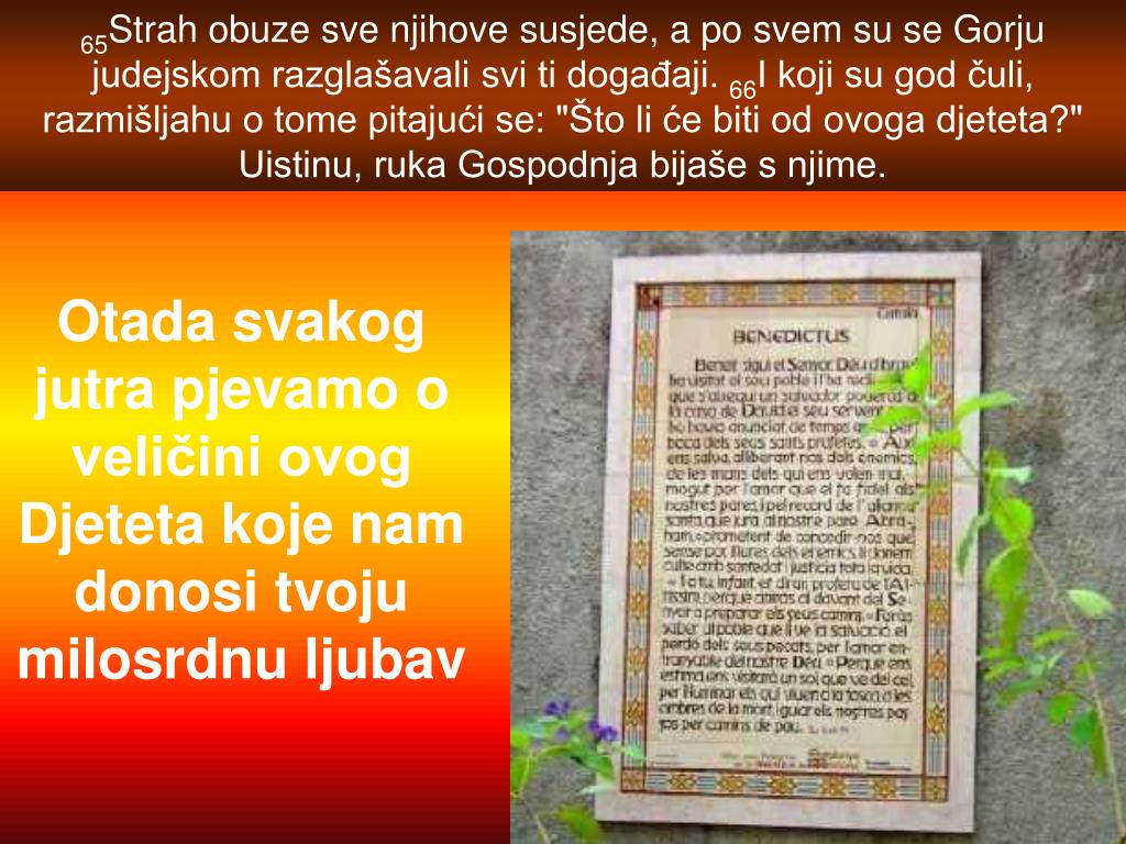 65Strah obuze sve njihove susjede, a po svem su se Gorju judejskom razglašavali svi ti događaji. 66I koji su god čuli, razmišljahu o tome pitajući se: "Što li će biti od ovoga djeteta?" Uistinu, ruka Gospodnja bijaše s njime. Otada svakog jutra pjevamoo veličini ovog Djetetakoje nam donosi tvoju milosrdnu ljubav