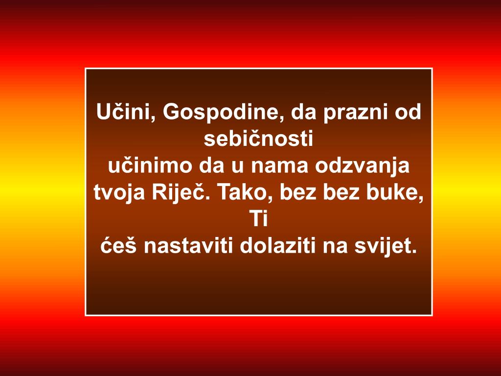 Učini, Gospodine, da prazni od sebičnosti učinimo da u nama odzvanja tvoja Riječ.Tako, bez bez buke, Ti ćeš nastaviti dolaziti na svijet.