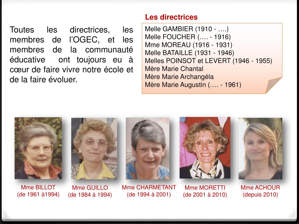 Les directrices Toutes les directrices, les membres de l’OGEC, et les membres de la communauté éducative ont toujours eu à cœur de faire vivre notre école et de la faire évoluer. Melle GAMBIER (1910 - ….) Melle FOUCHER (…. - 1916) Mme MOREAU (1916 - 1931) Melle BATAILLE (1931 - 1946) Melles POINSOT et LEVERT (1946 - 1955) Mère Marie Chantal Mère Marie Archangéla Mère Marie Augustin (…. - 1961) Mme BILLOT (de 1961 à1994) Mme CHARMETANT (de 1994 à 2001) Mme ACHOUR (depuis 2010) Mme MORETTI (de 2001 à 2010) Mme GUILLO (de 1984 à 1994)
