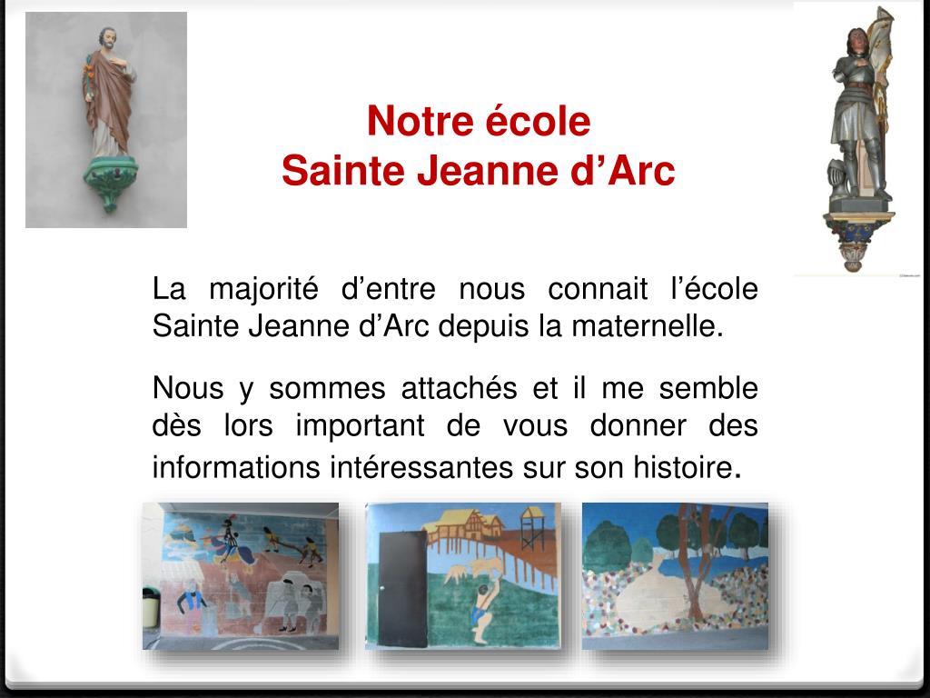 Notre école • Sainte Jeanne d’Arc • La majorité d’entre nous connait l’école Sainte Jeanne d’Arc depuis la maternelle. • Nous y sommes attachés et il me semble dès lors important de vous donner des informations intéressantes sur son histoire.