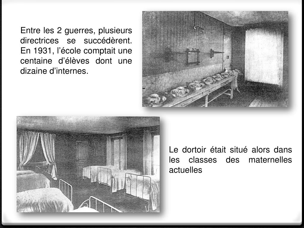 Entre les 2 guerres, plusieurs directrices se succédèrent. En 1931, l’école comptait une centaine d’élèves dont une dizaine d’internes. Le dortoir était situé alors dans les classes des maternelles actuelles