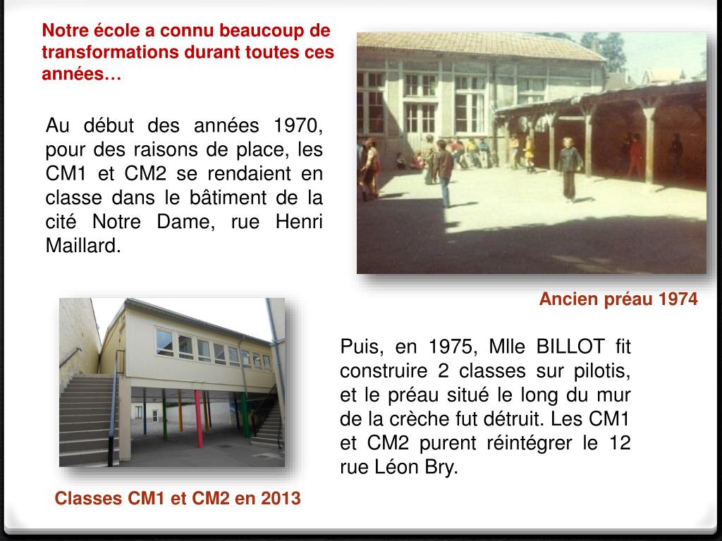 Notre école a connu beaucoup de transformations durant toutes ces années… Au début des années 1970, pour des raisons de place, les CM1 et CM2 se rendaient en classe dans le bâtiment de la cité Notre Dame, rue Henri Maillard. Ancien préau 1974 Puis, en 1975, Mlle BILLOT fit construire 2 classes sur pilotis, et le préau situé le long du mur de la crèche fut détruit. Les CM1 et CM2 purent réintégrer le 12 rue Léon Bry. Classes CM1 et CM2 en 2013